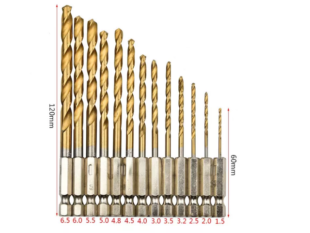 Чудовий набір свердел із 13 шт. від 1.5 мм до 6.5 мм, з покриттям нітриду титану. Хвостовик шестигранний. Слугує набагато довше завдяки покриттю. Нітрид титану сприяє швидшому свердлінню з меншою силою.